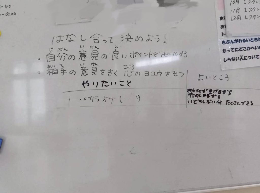 子どもたちの主体性と話し合う力を養うために会議形式で決めてもらいました!!みんなそれぞれ行きたい場所や魅力をわかりやすくアピール出来ており、スムーズに決めることができていました✨カラオケもみんな好きな歌が同じな事が多くて楽しかったね🔥